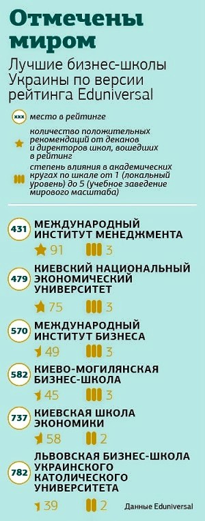За результатами глобального рейтингу Eduniversal Інститут бізнес-освіти КНЕУ займає друге місце серед бізнес-шкіл міжнародного рівня в Україні: http://m.nv.ua/ukr/business/publications/pidprijemtsi-i-top-menedzheri-kinulisja-v-biznes-shkoli-vchitisja-robiti-groshi-100725.html